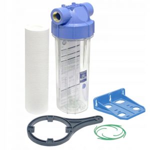 В комплекте корпуса для фильтра содержится: корпус для фильтра, картридж с пропускной способностью в 5 мкм, а также кронштейн для монтажа, ключ и кольцо уплотнителя.