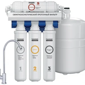 5-ступенчатый компактный фильтр обратного осмоса с возможностью замены картриджей без применения специальных инструментов. Обеспечивает глубокую комплексную очистку. Поры обратноосмотической мембраны сопоставимы с размерами молекул воды, поэтому они задерживают 99,9% примесей: соли жесткости, тяжелые металлы, бактерии, вирусы, опасные химические соединения.